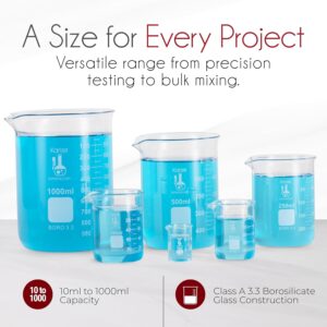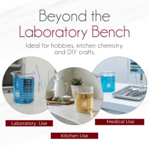 The borosilicate construction offers resistance to heat, thermal shock, acids, and alkalis, making the beakers suitable for heating and mixing applications. The durable design supports repeated use in science classrooms, research labs, and training centers.