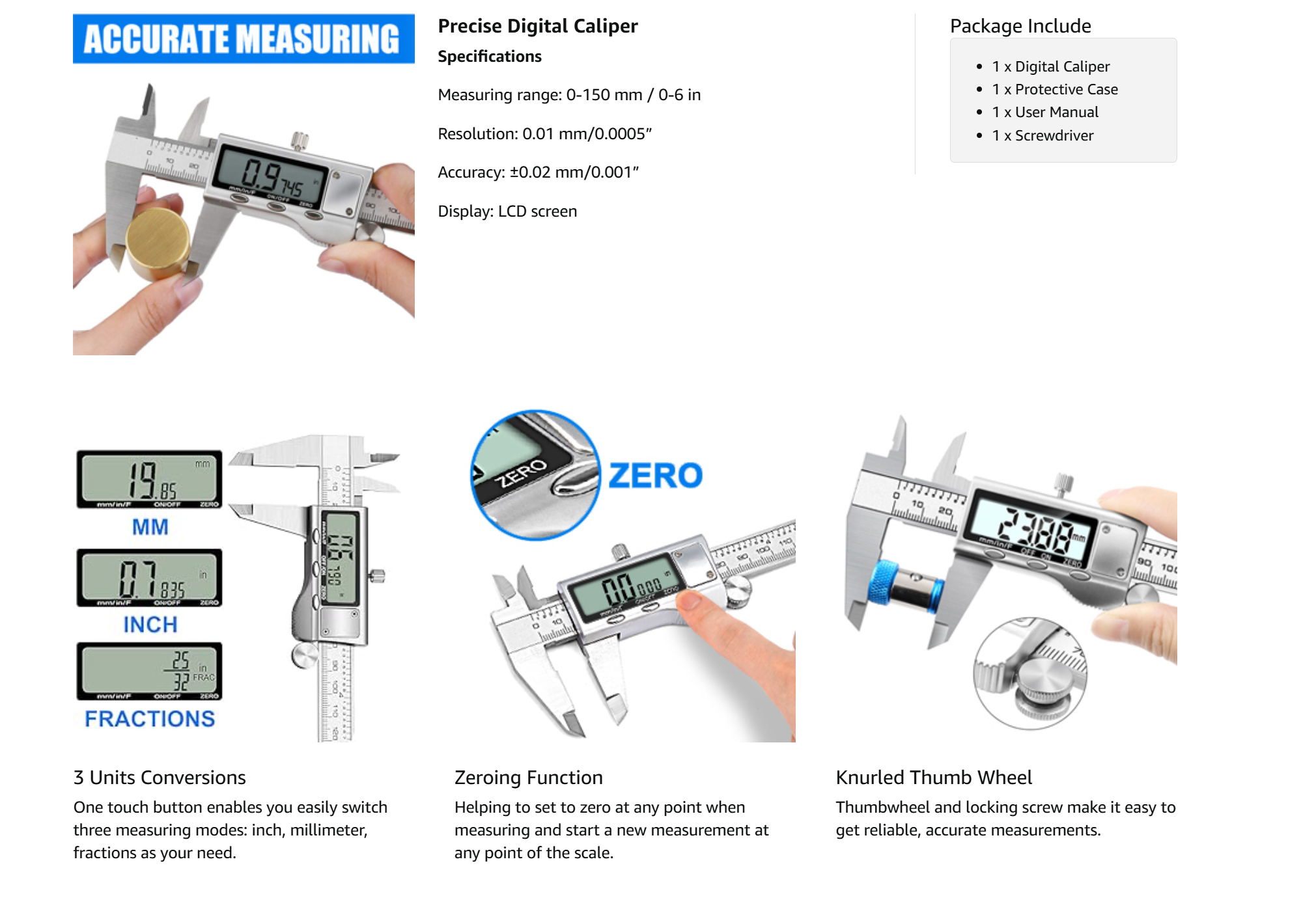 The measuring range covers 0–6 inches (0–150mm) with an accuracy of ±0.001″ (0.02mm) and resolution of 0.0005″ (0.01mm). The smooth sliding mechanism ensures consistent readings, while the zero-reset button allows differential measurement at any position along the scale.