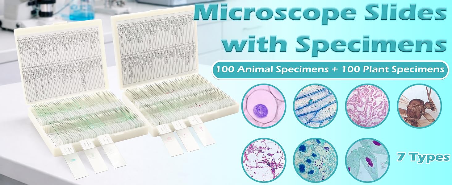 This educational microscope slide set includes 200 prepared specimens featuring 100 plant samples and 100 animal tissue samples. The collection is designed to support biology learning, classroom demonstrations, and laboratory observation exercises, helping students understand microscopic structures in a clear and organized manner.