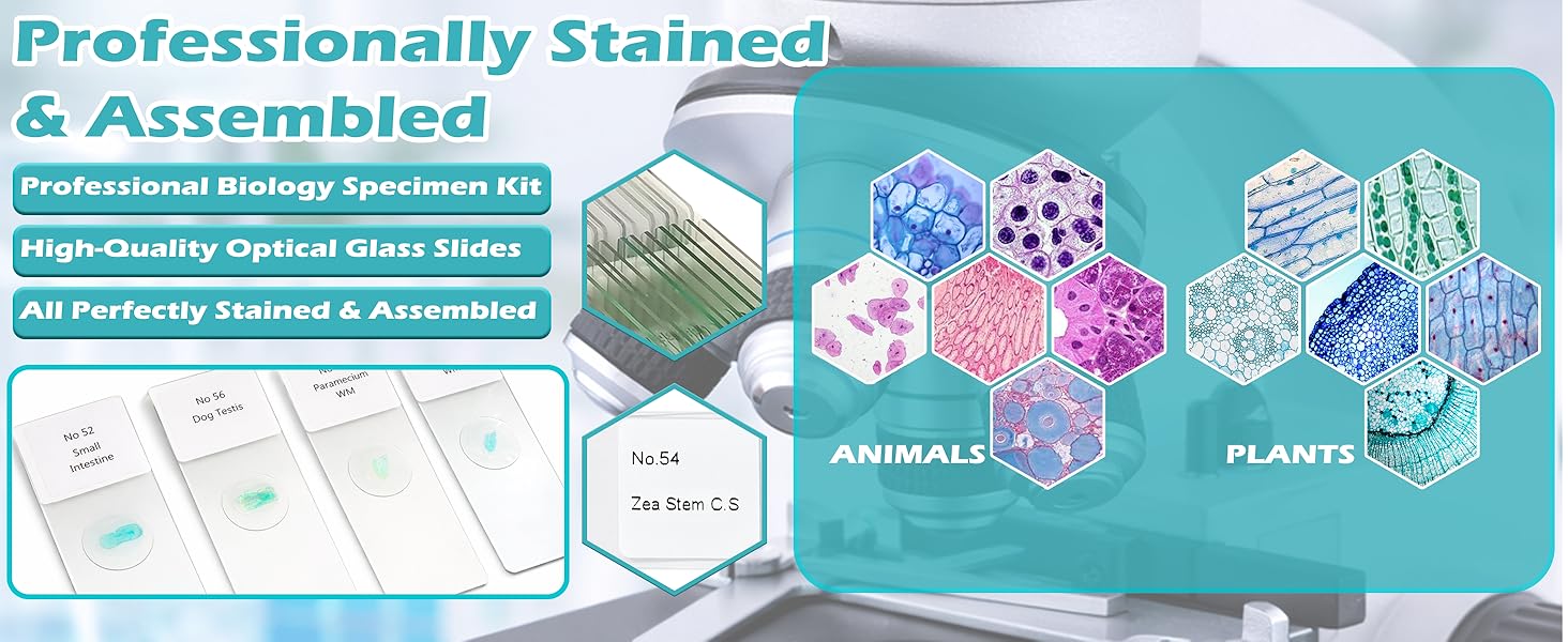 Microscope Prepared Slides Set – 200 Assorted Animal, Plant & Human Tissue Specimens, Rounded Edge Design for Biology Education