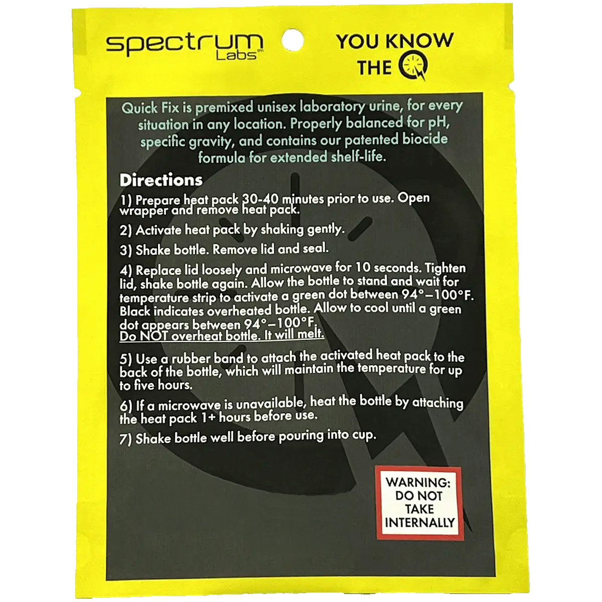 Slow preparation process. People who don’t know when to start their urine kit preparation usually use. Take the QuickFix urine bottle out of the box and attach the heating pad to the back of the bottle as instructed above. Place it on the opposite side of the temperature strip, using the included rubber band. keep the fake pee in your pants or leg using our belt, body heat helps maintain proper temperature and assists warming. If you cannot keep the fake urine on you, it will take about 45 minutes to reach 92–99°F. When carrying the screen cup to the bathroom, follow the previously given instructions exactly and remember to gently shake the bottle to introduce natural-looking bubbles into the Quick Fix urine.